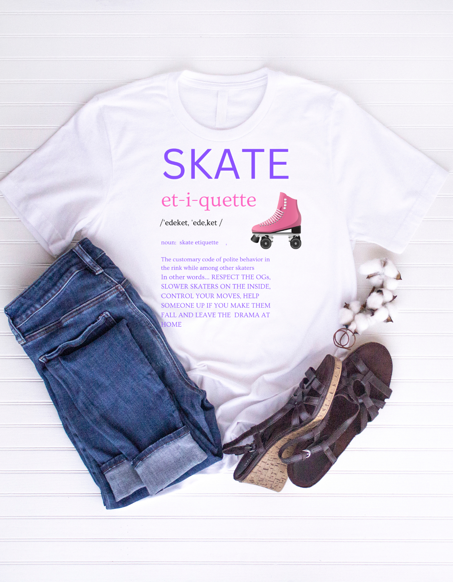Message: "Skate Etiquette" - These principles include sharing the skate floor, encouraging newcomers, and maintaining a positive attitude. Wear this shirt to promote these values and foster a welcoming skate culture.